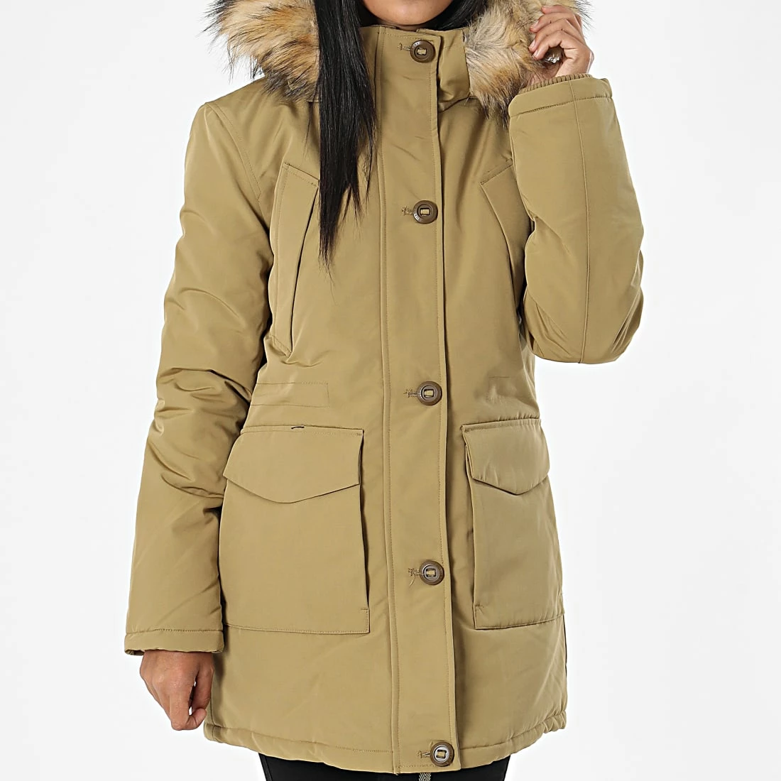 • Capuche boutonnée amovible avec fourrure synthétique amovible
